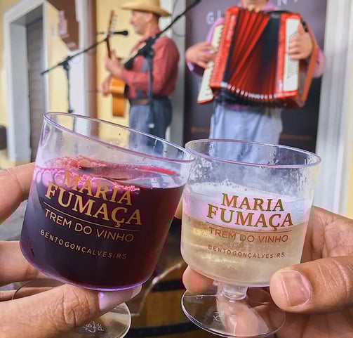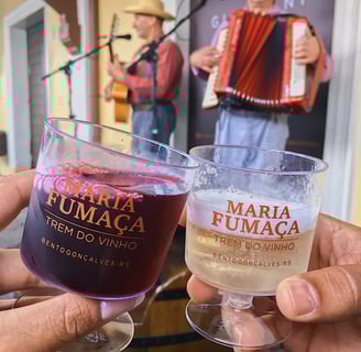 Logo cedo, embarcamos na Maria Fumaça, em um trajeto que passa por Bento Gonçalves, Garibaldi e Carlos Barbosa. A viagem é animada do começo ao fim, com shows de música italiana e gaúcha, degustações de vinho, espumante e suco de uva, além de muita interação com os passageiros. Mas o grande destaque foram mesmo as paisagens de inverno: montanhas cobertas de neblina, vinhedos adormecidos e aquele clima serrano aconchegante que parece cenário de filme.