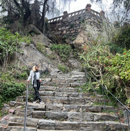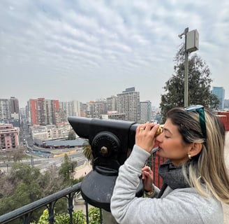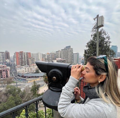 Depois, seguimos para o Cerro Santa Lucía, um dos pontos mais clássicos da cidade. Subimos suas escadarias, passeamos pelos jardins, mirantes e fontes, e de lá tivemos uma vista linda de Santiago. Um lugar perfeito pra fotos e um momento de pausa no meio do dia.