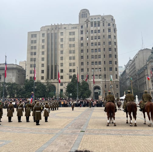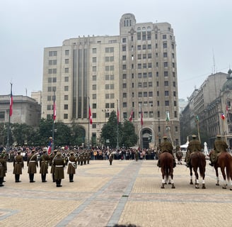 Começamos pelo imponente Palácio de La Moneda, sede do governo chileno. Tivemos a sorte de estar lá bem no momento da troca de guarda, uma cerimônia tradicional, com banda, marcha e toda a formalidade que impressiona tanto adultos quanto crianças. Foi emocionante assistir àquele momento cheio de simbolismo bem de pertinho!