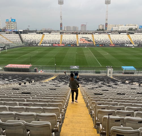 À tarde, foi a vez de conhecer o Estádio Monumental David Arellano, casa do Colo-Colo, o time mais tradicional e popular do Chile. Bruno, que ama futebol, estava super empolgado! Fizemos um tour externo, visitamos as arquibancadas, conhecemos um pouco mais sobre a história do clube e o impacto que ele tem no país.